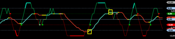 Por outro lado, quando as cores das duas linhas estão desalinhadas, o mercado tende a apresentar movimentos lateralizados, devido ao conflito de forças no fluxo de mercado.