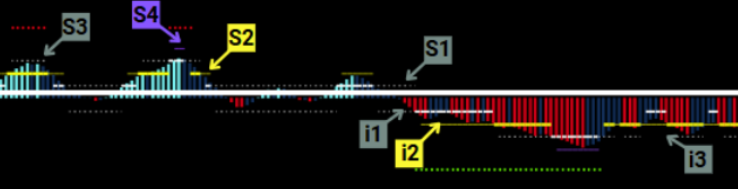 - O Rompimento das Linhas (MAPs): O VX possui linhas horizontais que correspondem às MAPs (linhas s1, s2, s3… para cima e i1, i2, i3… para baixo). Quando as barras verticais do VX rompem uma dessas linhas, a linha horizontal se torna mais espessa. Essa é uma confirmação visual de que o preço rompeu a MAP correspondente, indicando que a tendência atual tem força para continuar.